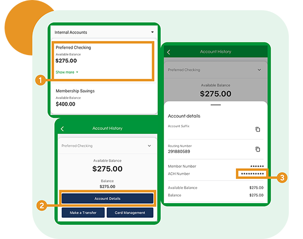 - Checking Account: ACH number assigned at account opening; see below for how to access your checking account number